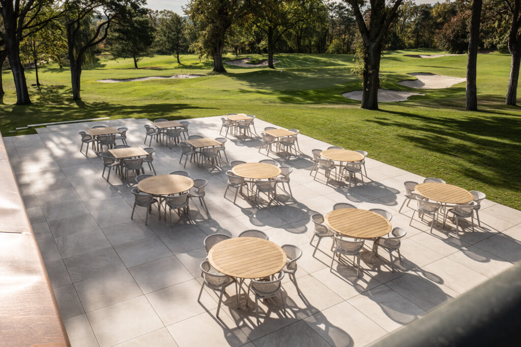 Die neue Südterrasse bietet eine wunderschöne Aussicht auf die Golfanlage. Direkt vorgelagert befinden sich der ebenfalls neu erweiterte Kurzspielbereich sowie der 9-Loch-Platz. Das offene und einladende Ambiente eignet sich zudem hervorragend für die Nutzung im Rahmen von Veranstaltungen.