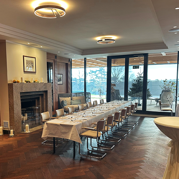 Bis zu 30 Personen können an einer repräsentativen Tafel Platz nehmen und sich von unserer Gastronomie kulinarisch verwöhnen lassen. Sonst bietet das Kaminzimmer Raum zum Verweilen, für Gespräche oder gemütliches Zeitunglesen. Insbesondere im Winter lockt das Kaminzimmer durch ein stimmungsvolles Feuer im offenen Kamin. Neben Fotos aus der Vergangenheit des Golf- und Land-Club Berlin-Wannsee e.V. finden sich hier auch Pokale und Preise, die Mannschaften des Golf- und Land-Club Berlin-Wannsee e.V. in der inzwischen über 125-jährigen Geschichte des Traditionsclubs gewonnen haben.