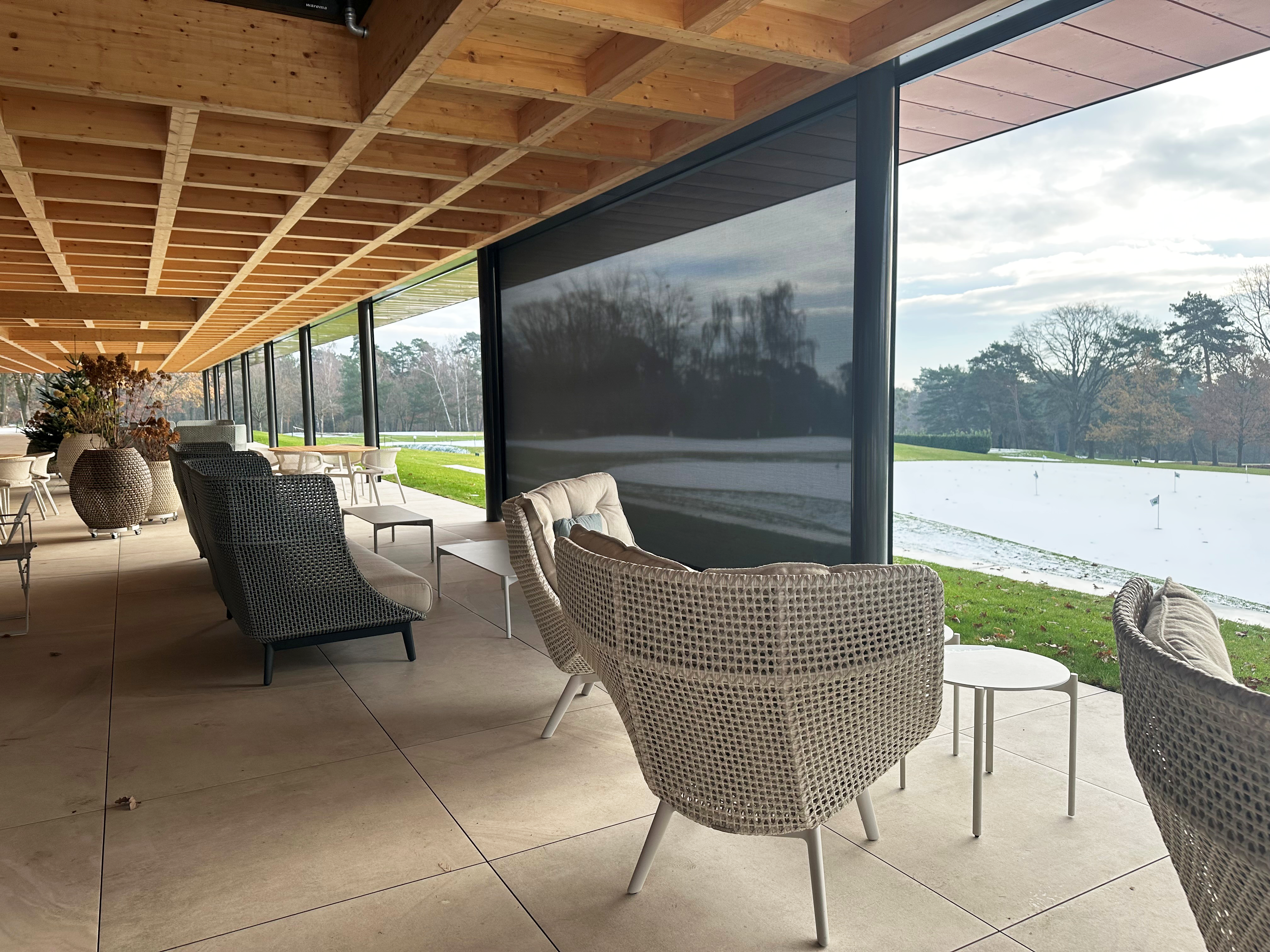 Südterrasse mit elektrisch schließenden Senkrecht-Markisen